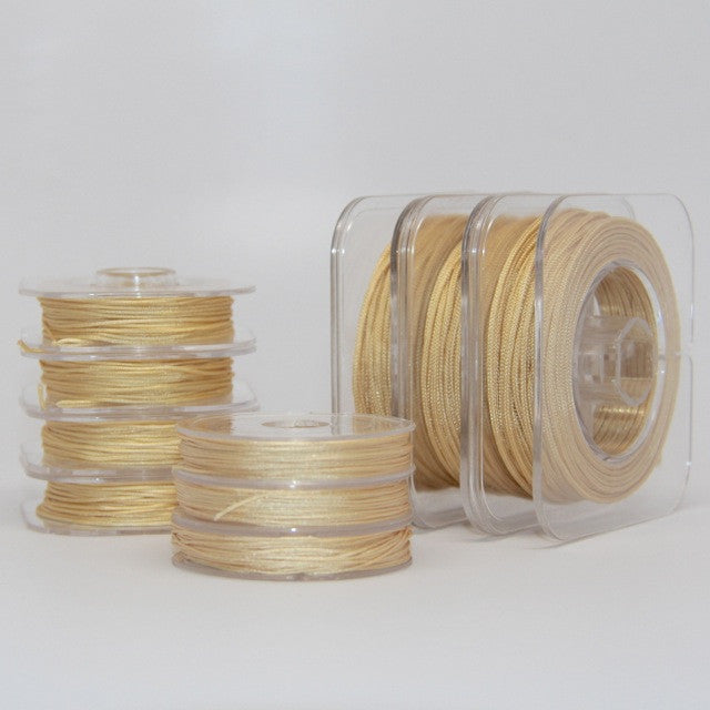 Our little bobbins of Chinese knotting cord are perfect for those smaller, special projects.  Choose the .4mm size for laddering or tassels, our .5mm or .8mm/1mm for micro-macrame, the 1.4mm for those ever popular shamballa or kumihimo and (our new addition) the 2mm for rope bracelets or to showcase your favorite pendants.
